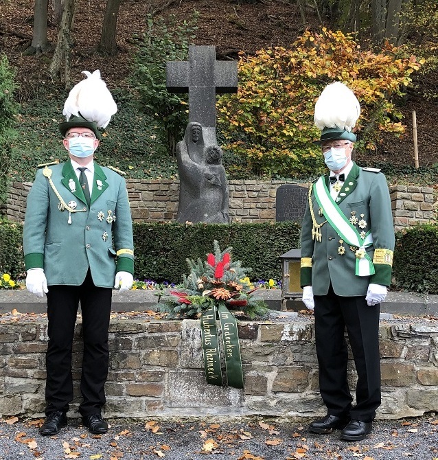 Auch wenn wegen der Corona-Pandemie alle Veranstaltungen der Rheinecker Kirmes am vergangenen Wochenende ausfallen mussten, so haben die Rheinecker Schützen die Gefallenen und Verstorbenen der Kriege und der Bruderschaft nicht vergessen. Brudermeister Hans Oskar Degen und sein Stellvertreter Günther Berlin legten unter Corona-Bedingungen für die St. Hubertus Schützenbruderschaft am „Kirmessonntag“ am Ehrenmal auf dem Friedhof zu Ehren der Verstorbenen ein Blumengebinde ab.